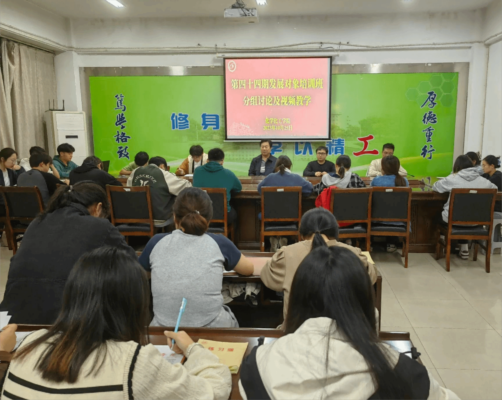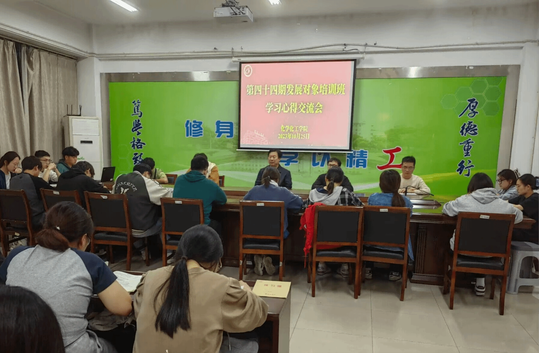 为进一步加强党员发展对象的培养、教育和考察,端正入党动机,严把发展党员“入口关”“质量关”,切实提高党员发展对象的政治素质和理论修养,10月25日,化学化工学院在学院201会议室组织第四十四期发展对象培训班学习心得交流会。学院党委副书记江滔主持,组织员、学生第一党支部书记唐智及27名发展对象参加。