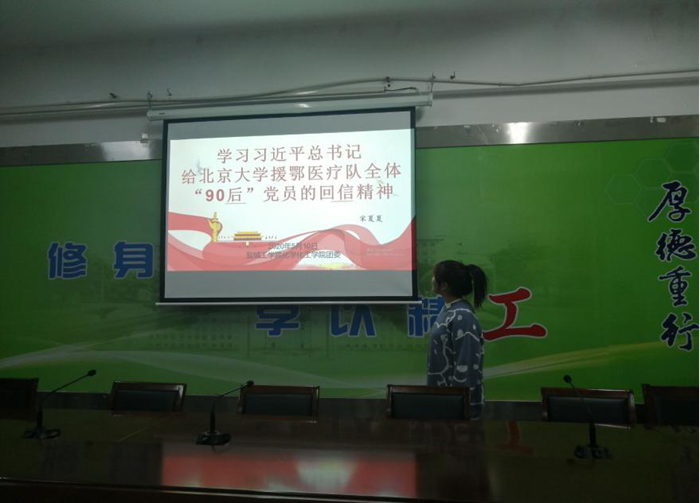 2020年10月10日,在盐城工学院化学化工学院201会议室召开学习“习近平总书记给北京大学援鄂医疗队全体“90”后党员的回信”,学院团委学生副书记、院青马工程班学生指导老师宋夏夏主讲。