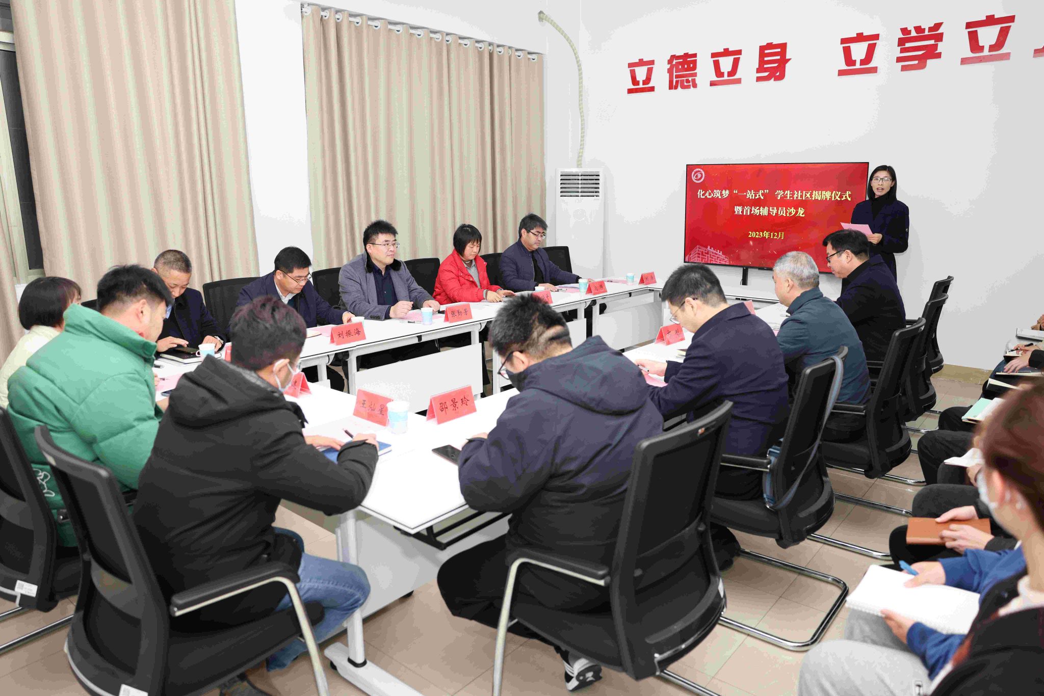 江滔代表学院介绍了化心筑梦“一站式”学生社区的建设情况。揭牌仪式结束后,校领导与参会人员共同参观了学生社区各功能区,为下一步更好地开展学生社区育人工作进行现场指导。接着,学院组织专兼职辅导员开展“一站式”学生社区首场辅导员沙龙活动,围绕社区管理模式研讨交流。