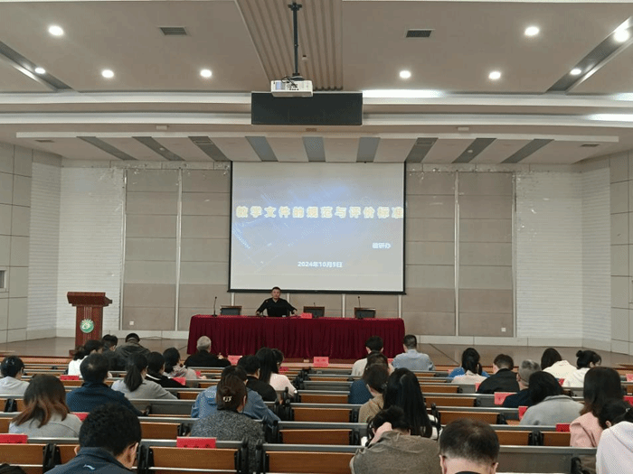 教科研办主任李立冬作《教学文件的规范与评价标准》专题培训。首先,他结合学校教学文件抽查评价反馈意见,指出课程教学文件、课程试卷和毕业设计等不同类型教学文件中常见的不合规、待整改的情况。他依据学校教务处、评估处相关文件精神,介绍了理论课程、实验(实践)课程、毕业设计(论文)等教学文件的规范要求、评价项目及评价标准,重点解读了课程教学大纲如何与人才培养目标相锲合、“思政元素”如何有效融入教学等A级教学质量指标。最后,他与老师们共同学习了审核评估期间的工作要求,传达了学校学院对审核评估工作的安排、保障及预案。