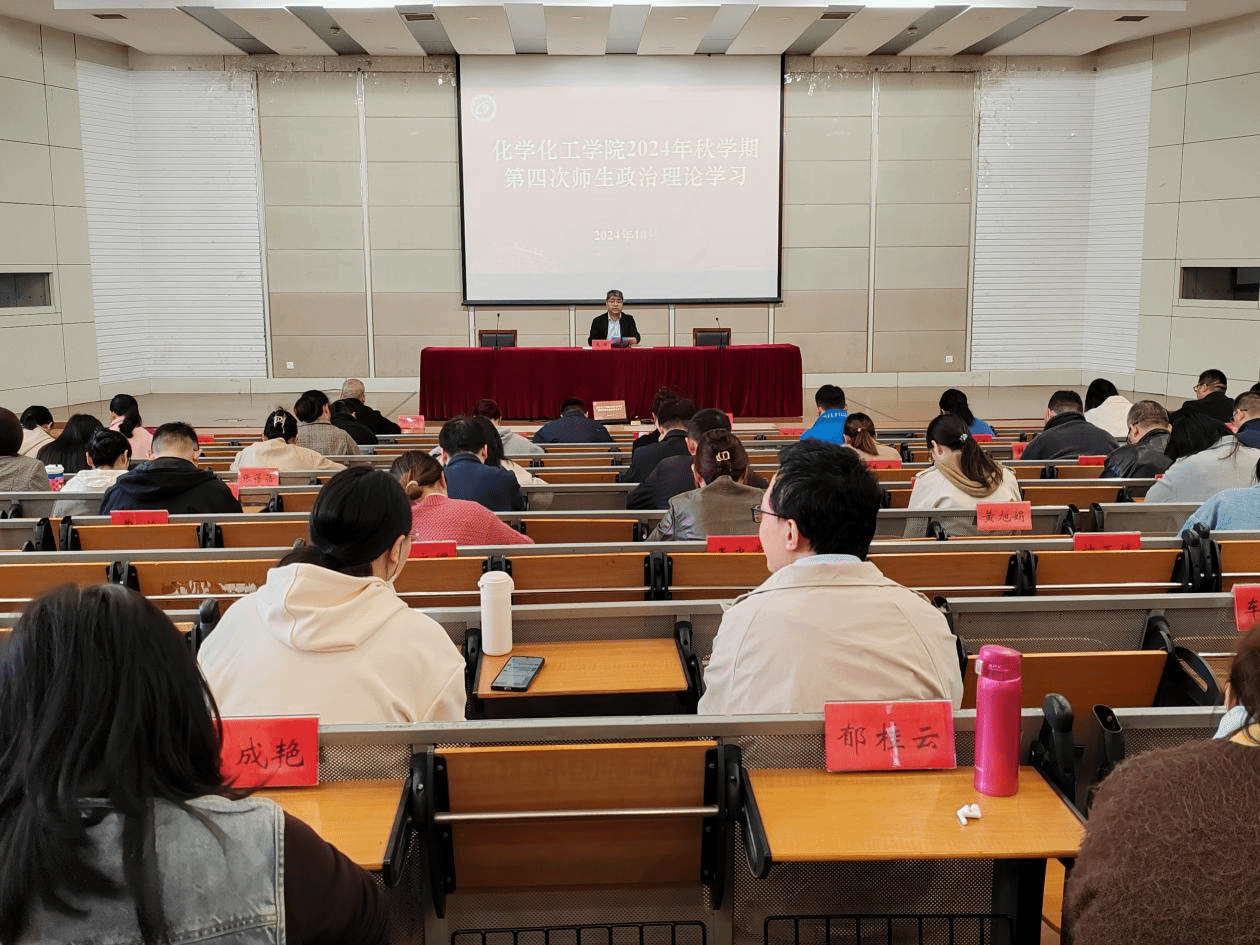 10月23日下午,化学化工学院在北校区化工楼报告厅组织开展2024年秋学期第四次师生政治理论学习。学院党委书记庞辉主持,学院全体教职工、学生党员和学生干部代表参加学习。