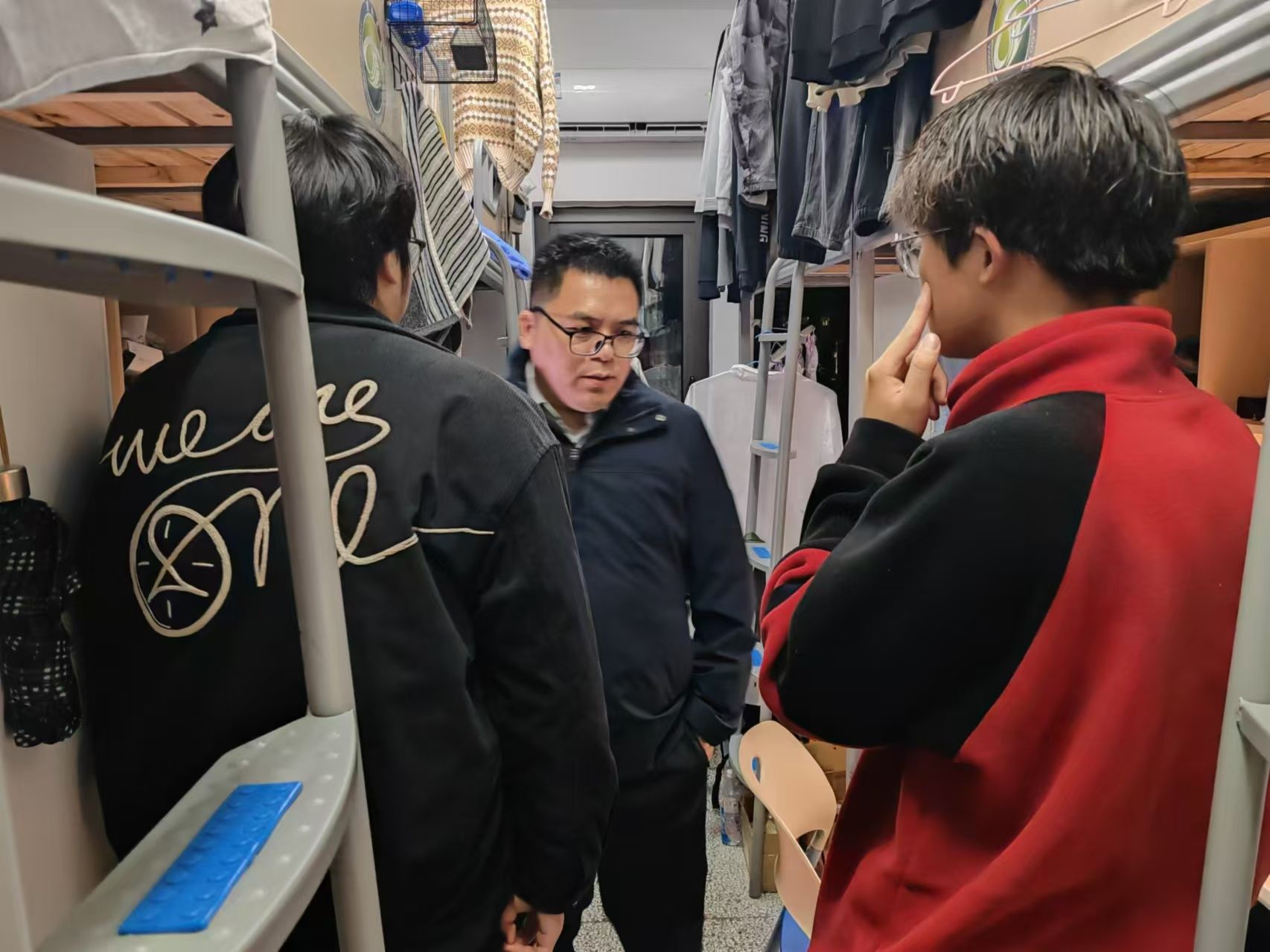在宿舍走访过程中,邵景玲亲切询问了同学们的学习及生活情况,全方位了解学生的需求与困惑,关心他们的心理健康情况。他要求,同学们要遵循高标准的内务要求,保障宿舍舒适生活的同时,更要注意宿舍安全,坚决杜绝大功率等违规电器的使用。他鼓励大家要珍惜大学时光,努力学习专业知识,积极参与实践活动,不断提升自己的综合素质。