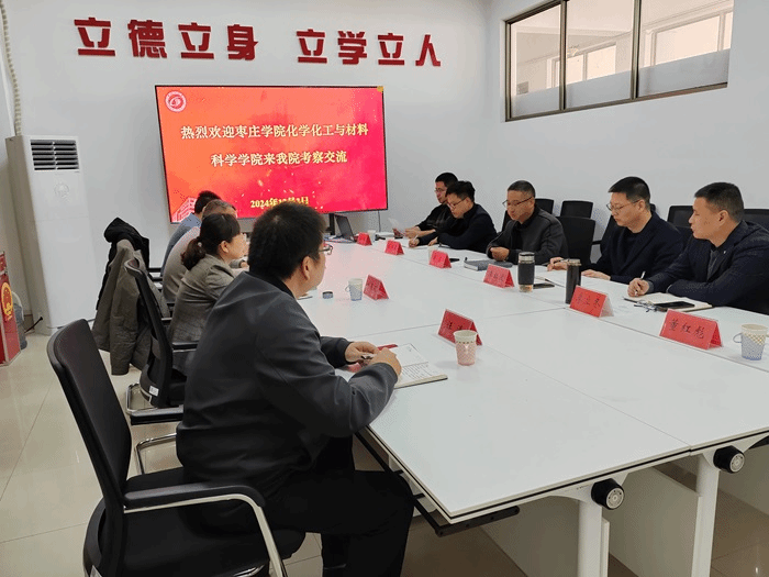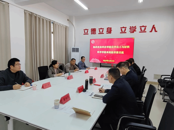 12月3日上午,枣庄学院化学化工与材料科学学院院长刘春丽、党委书记谭胜兵、党委副书记汪涛和副院长马杰等一行4人来我校考察交流。化学化工学院院长戴勇、副院长李红波出席交流活动,学院党政办公室主任孙开涌、教科研办公室主任李立冬、化学工程系主任谷峰和党务秘书董红彪参加。
