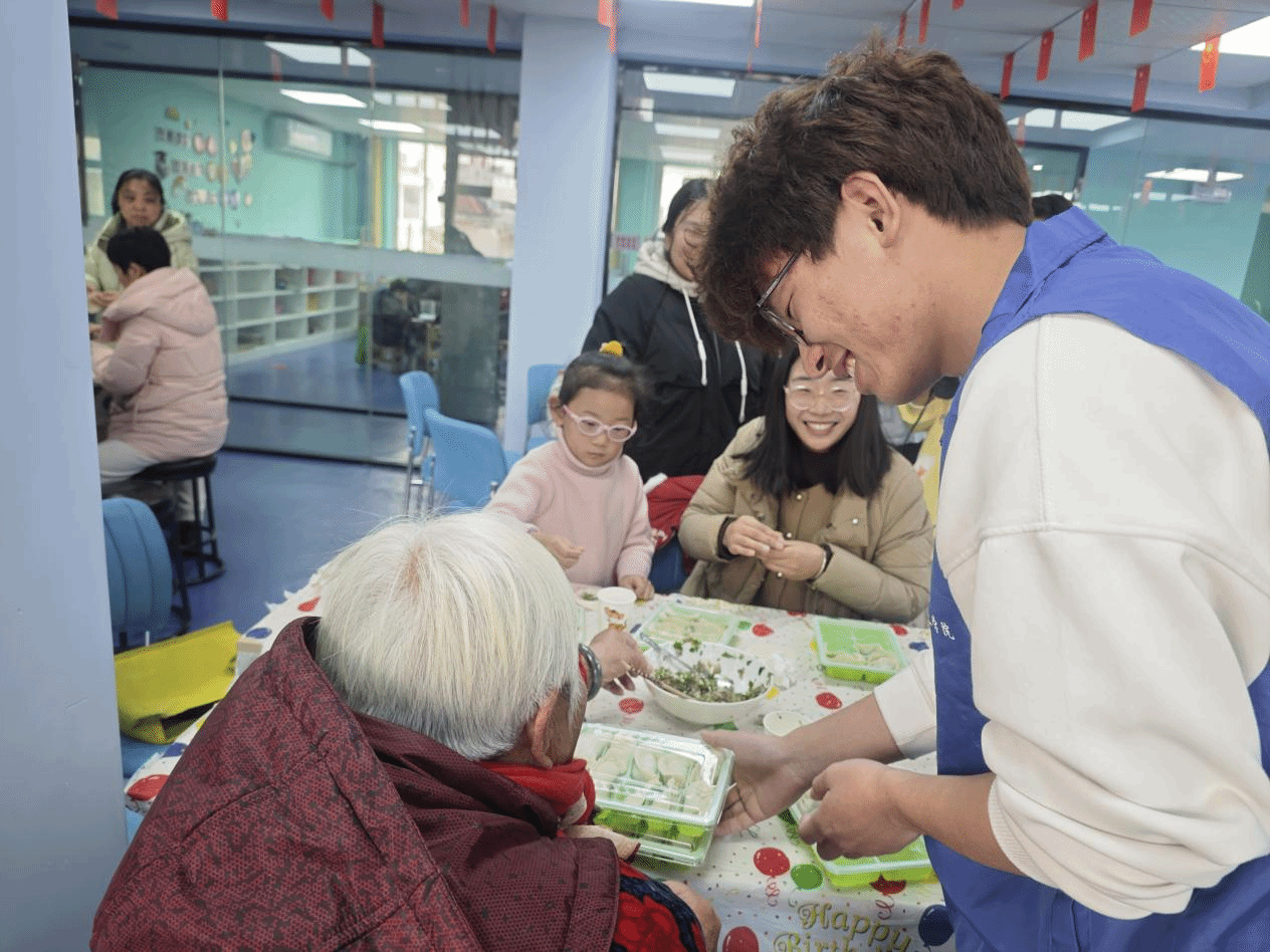 在煮饺子的间隙,同学们分发贺卡,并邀请社区小朋友们在贺卡上写下冬日祝福。当热气腾腾的饺子摆满餐桌,那袅袅升腾的香气瞬间弥漫开来。自己亲手包制的饺子是冬至最特别的味道,每一口都饱含着满足与幸福。随后同学们将贺卡连同煮好的饺子一同送给社区的独居老人,为老人们送上了冬日的祝福与温暖。
