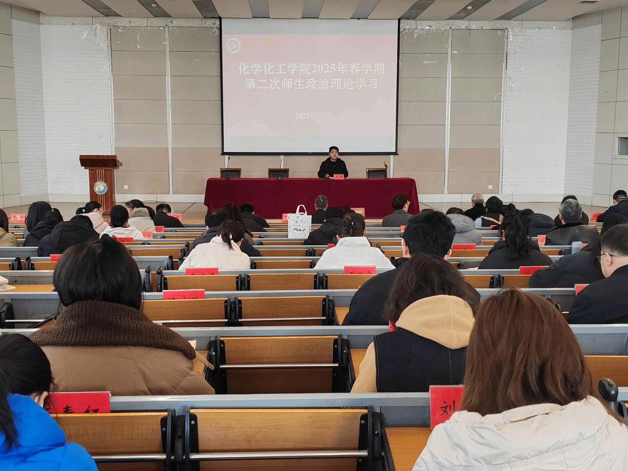3月19日下午,化学化工学院在北校区化工楼报告厅组织开展2025年春学期第二次师生政治理论学习。学院党委书记庞辉主持,学院全体教职工、学生党员和学生干部代表参加。