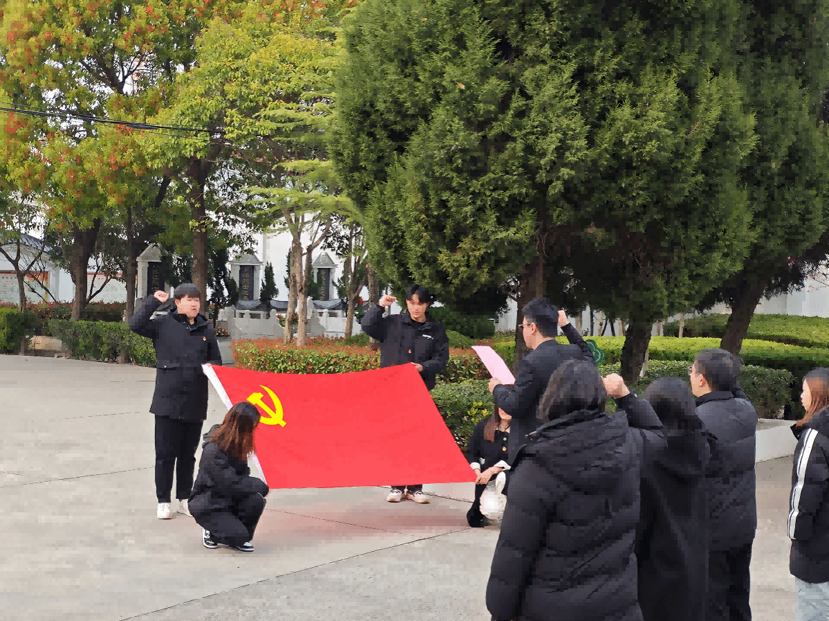 下午3时,全体师生列队肃立于烈士纪念碑前,活动在雄壮的国歌声中拉开序幕。两名学生党员代表缓步上前,向烈士纪念碑敬献花篮,以最庄重的仪式表达对先烈的敬仰。随后,全体师生低头默哀,在静谧的氛围中,每个人心中涌起对革命烈士的追思与敬意。默哀结束,大家向烈士三鞠躬,依次上前瞻仰纪念碑并敬献鲜花,一朵朵鲜花承载着对先烈们的深切缅怀,寄托着对革命先辈的感恩之情。祭扫仪式尾声,学生第二党支部书记曹亚明带领全体党员,面向党旗,重温入党誓词。铿锵誓言回荡在陵园上空,彰显新时代青年党员赓续红色血脉、勇担历史使命的坚定信念。