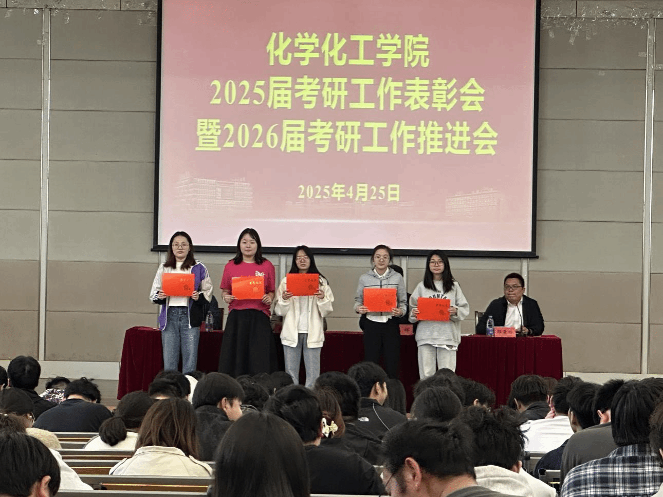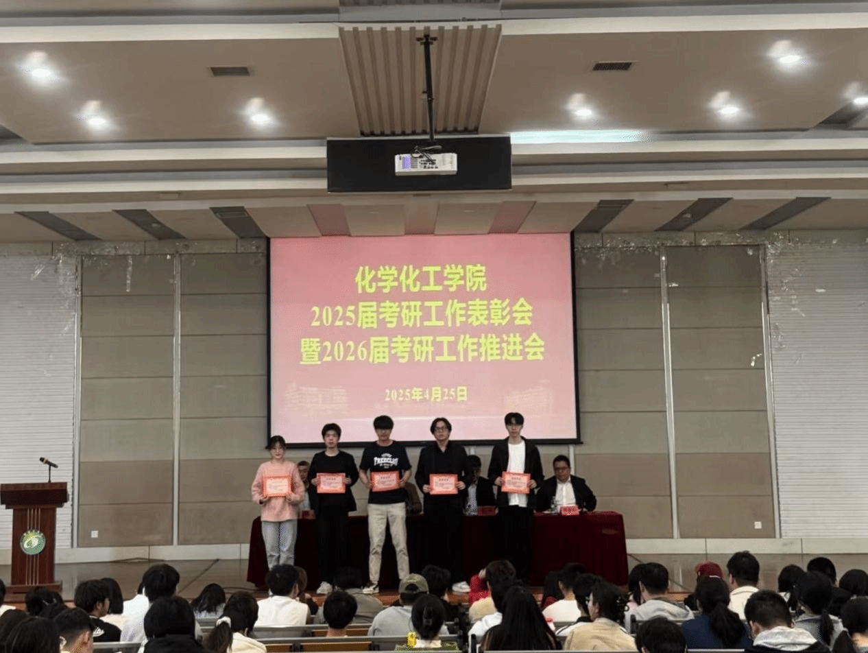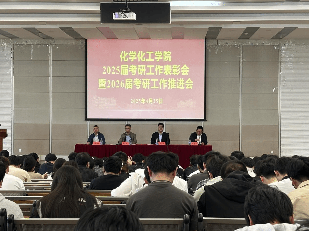 为总结表彰2025届学生考研工作,助推2026届考研工作取得新进展、新突破,4月25日下午,化学化工学院联合“化心筑梦”一站式社区在化工楼报告厅开展2025届考研工作表彰会暨2026届考研工作推进会。化学化工学院院长戴勇、党委书记庞辉、副院长祁刚出席本次会议,2025和2026届毕业班辅导员、2025届考研学生代表及2022级全体学生参加。党委副书记邵景玲主持会议。