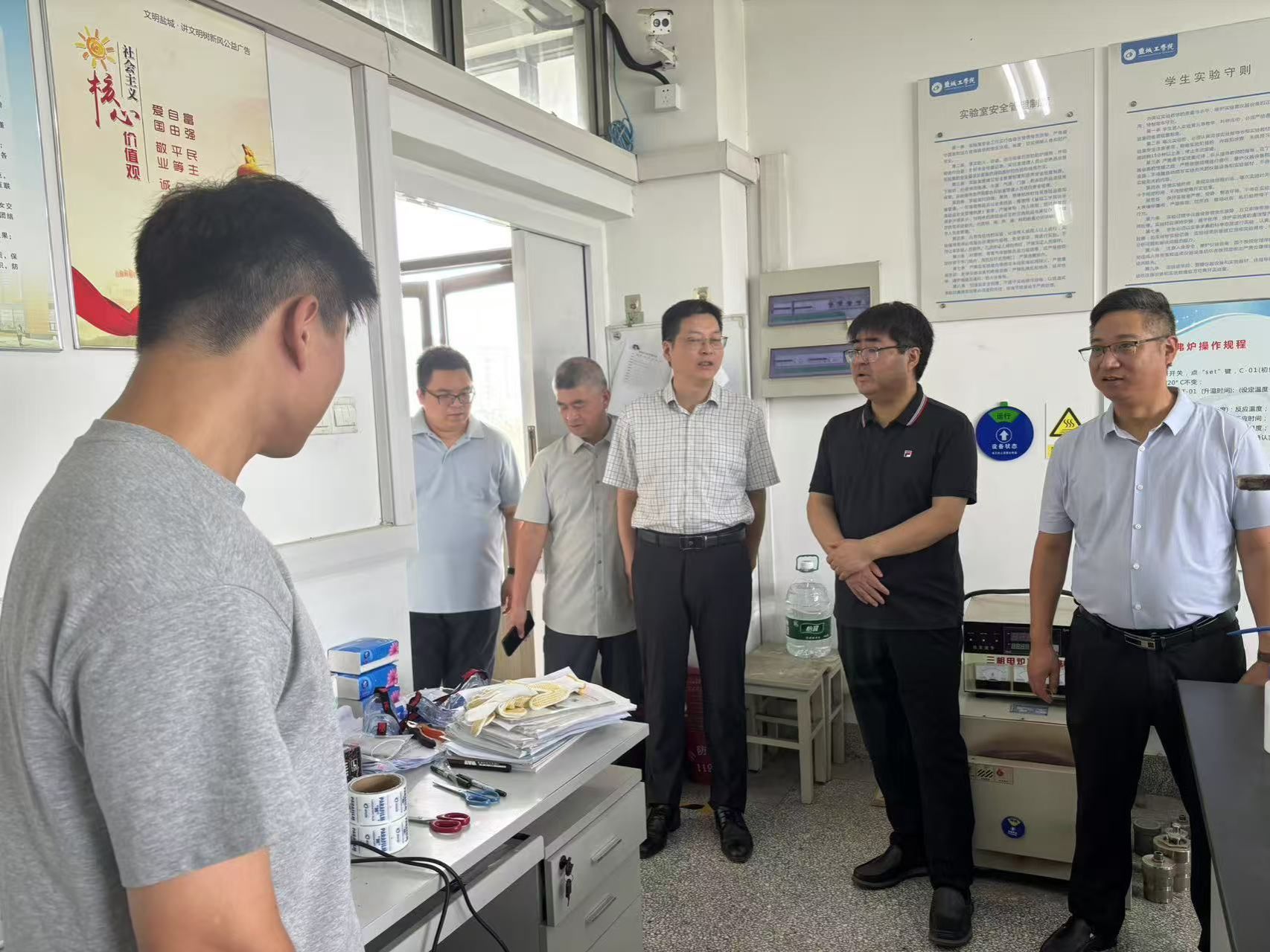 学院领导老师首先走访检查实验室,询问了解实验室开放使用、人员管理、值班值守及危化品使用管理等安全责任落实情况,同时叮嘱师生要时刻紧绷安全这根弦,提高安全意识,明确安全责任,严格遵守实验室规章制度,切实保障暑期实验室安全平稳运行。学院领导看望了正在实验室学习工作的师生,关心了解师生在校生活、学习、科研等情况,重点询问2026届研究生科研工作进度以及在科研工作中遇到的困难,鼓励大家充分利用假期潜心钻研,力争产出更多高质量成果。