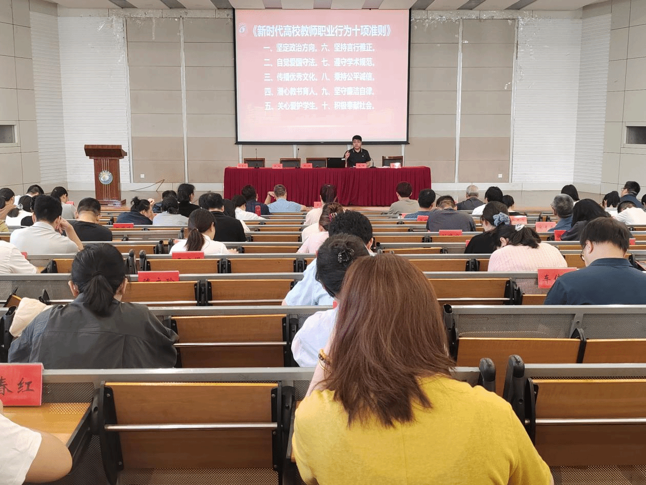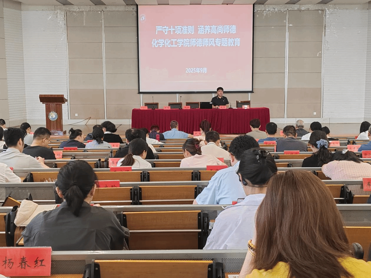 为加强师德师风建设,营造风清气正的育人环境,9月10日下午,化学化工学院在北校区化工楼报告厅以“严守十项准则 涵养高尚师德”为主题召开师德师风专题教育会。学院党委书记庞辉讲授师德必修课,学院全体教师参会。
