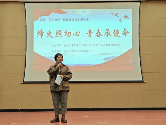 12月3日晚,由共青团盐城工学院委员会主办,化学化工学院承办的第三十届校园文化艺术节子项目——第十三届“烽火照初心,青春承使命”校园演讲大赛决赛,在知达楼五四报告厅举行。原工会主席孙琴、党委宣传部副部长赵迎华、学生处副处长马晓英、校团委副书记胥爱国、化学化工学院党委副书记邵景玲受邀担任比赛评委,全校400余名师生现场观赛。