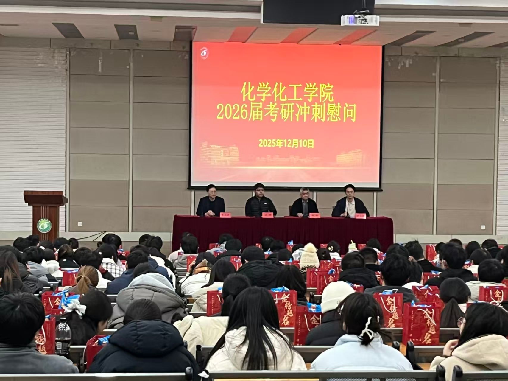 为鼓舞2026届考研学子斗志,缓解备考压力,12月10日晚上,化学化工学院联合“化心筑梦”一站式学生社区在化工楼报告厅举办考研冲刺慰问会。学院党委书记庞辉、副院长祁刚、李红波出席活动,学工办副主任杨立远主持,毕业班辅导员及2026届全体考研学生参加。