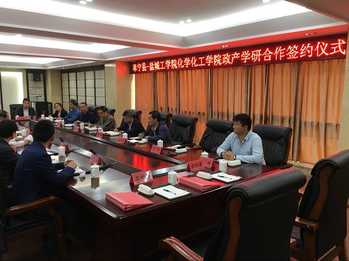 5月3日,化学化工学院党委书记谢毅敏,副院长祁刚、副院长戴勇率学院教授、博士一行9人到阜宁县出席“阜宁县——盐城工学院化学化工学院政产学研合作签约仪式”,并到阜宁高新技术开发区9家相关企业实地考察,调研企业在人才培养、科学研究、项目合作等方面的产学研需求,学院一行受到阜宁县副县长王国亮、科技局局长张虎、组织部副部长王军、高新技术开发区管委会主任陈斯红和相关政府部门、企业负责人的热情接待。中午,在签约仪式上,王国亮副县长介绍了阜宁县经济社会发展情况,谢毅敏书记介绍了盐城工学院特别是化学化工学院人才培养、科学研究和服务地方情况,张虎局长和戴勇副院长分别代表双方在合作协议上签字。