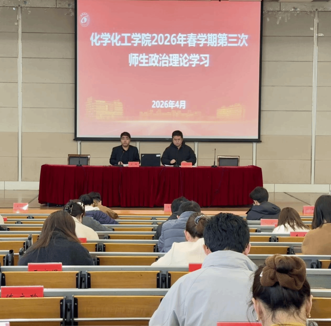 4月1日下午,化学化工学院在北校区化工楼报告厅组织开展2026年春学期第三次师生政治理论学习。学院党委书记庞辉主持,学院全体教职工、学生党员和学生干部代表参加。