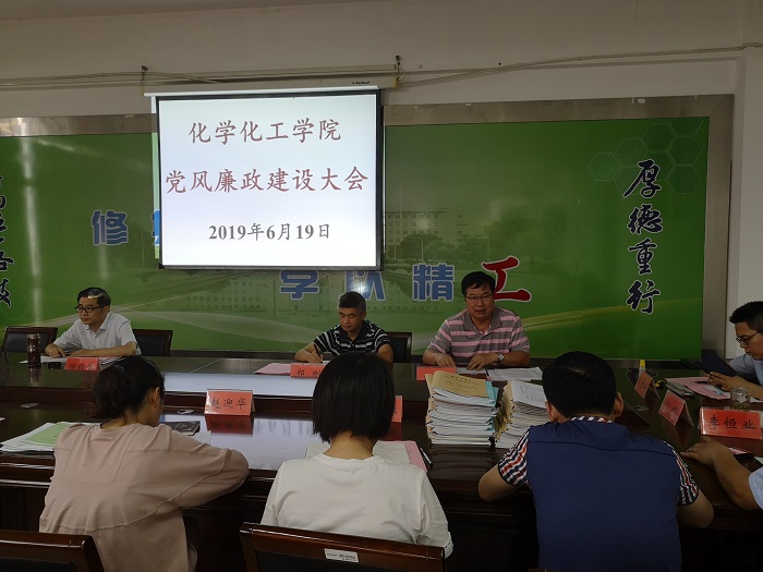 为深入贯彻落实党的十九大关于全面从严治党的战略部署和十九届中纪委三次全会精神,全面落实党风廉政建设责任制,2019年6月19日下午,化学化工学院在北校区教育超市楼201会议室召开党风廉政建设大会。学院党委书记谢毅敏主持大会,副院长祁刚、副院长戴勇、党委副书记兼纪检委员江滔和全体在校教职工70多人参加大会。