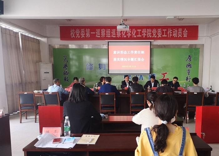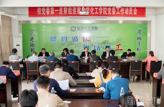 5月13日下午,校党委第一巡察组在化学化工学院会议室召开巡察化学化工学院党委工作动员会。第一巡察组组长、校党委常委、副校长王路明,意识形态专项督查组组长、校党委常委、宣传部部长韩雅丽,第一巡察组副组长、校纪委委员、图书馆馆长吴登国,校党委第一巡察组巡察专员周临震、周亚军、杨蕴和意识形态专项督查组全巡察专员王丽坤,化学化工学院党委书记谢毅敏、院长奚新国、党委副书记江滔、副院长祁刚、戴勇和师生代表共40多人参会。校党委巡察办副主任、校纪委办公室副主任(主持工作)陶应军主持动员会,并宣读《关于开展2020年春学期巡察工作的通知》。