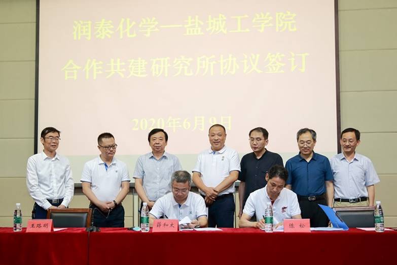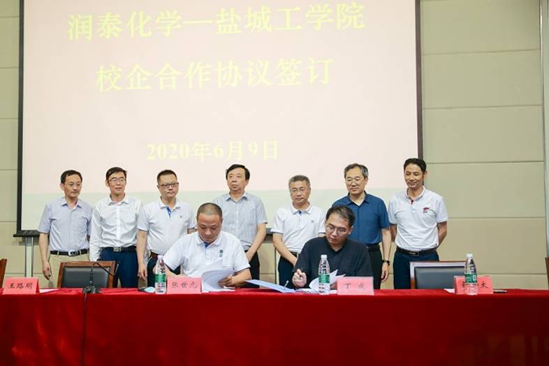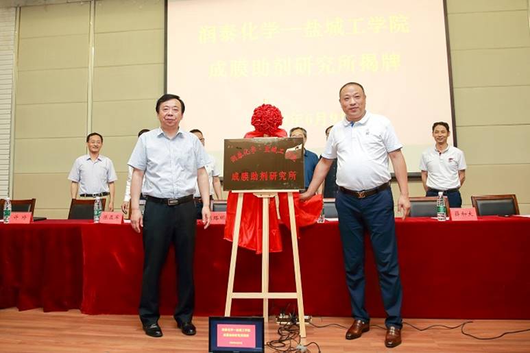 丁成处长与张世元董事长签订《校企合作协议》,副总裁薛和太和陈松教授签订《共建研究所协议》。王路明副校长与张世元董事长共同为“润泰化学盐城工学院成膜助剂研究所”揭牌。
