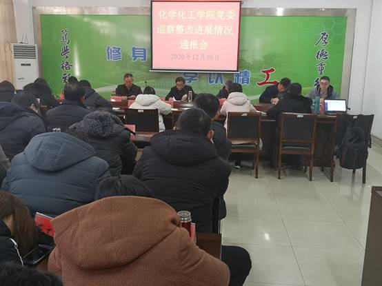 12月30日下午,化学化工学院在北校区化工学院会议室召开巡察整改情况通报会。会议由学院党委书记谢毅敏主持,校纪委朱孟峰老师和学院教职工参加会议。