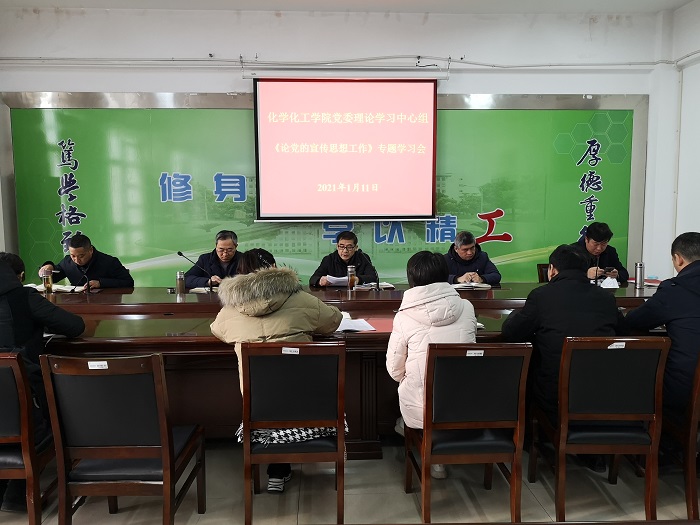 1月11日上午,化学化工学院党委理论学习中心组在北校区学院201会议室,召开2021年第一次集中学习会议。会议分两个阶段,第一阶段,召开中心组扩大会议,学院处、科级干部、各党支部书记、各专业系(教研部、实验中心)主任和全体专兼职辅导员参加此次学习,专题学习《论党的宣传思想工作》;第二阶段,全体中心组成员参加,研讨如何学习贯彻《中国共产党基层组织选举工作条例》,如何做好校园安全稳定工作。学院党委书记谢毅敏主持。