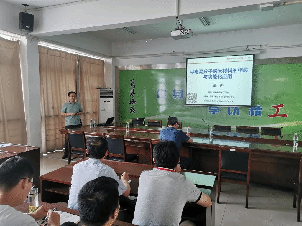 6月22日下午,扬州大学化学化工学院院长韩杰教授应邀来我校作题为“导电高分子纳米材料的组装与功能化应用”的学术报告。报告会由化学化工学院院长奚新国教授主持,化工学院、材料学院相关教师和研究生参加了报告会。