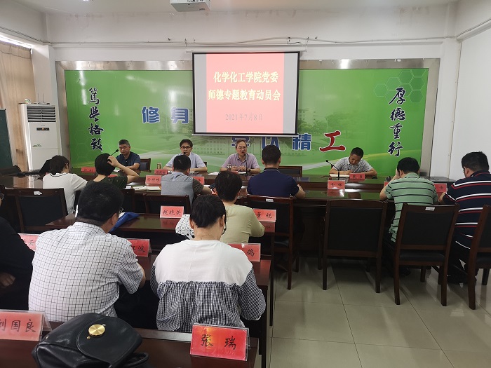 7月8日上午,化学化工学院党委在教育超市201会议室召开师德专题教育动员会。学院书记谢毅敏主持动员会,院长奚新国,副院长戴勇、祁刚,副书记江滔及各专业系主任、全院教师参加动员会。