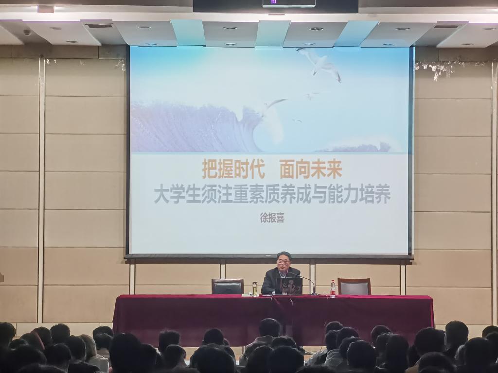 徐报喜从高中的“要我学”与大学的“我要学”两个不同阶段入手,从思想道德素质、专业知识与智力素质、人文素质、心理与身体素质四个方面,向同学们介绍了“什么是素质”;从综合分析能力、信息真伪辨别能力、人际协调能力、时间安排能力、表达能力和创新创业能力六个方面,详细解读了“什么是能力”。徐报喜认为,一个人的素质养成与能力培养是人生渐进不断提升的过程,须在喧嚣中学习、社会生活中静然、观照、感悟与修炼。他告诫同学们,大学时光非常短暂,过去就不会再来,不要等毕业了才后悔不已,要现在开始就规划好自己的大学四年时光,注重素质的养成与能力的培养,做一名既有专业知识又有能力与素质的合格大学生。
