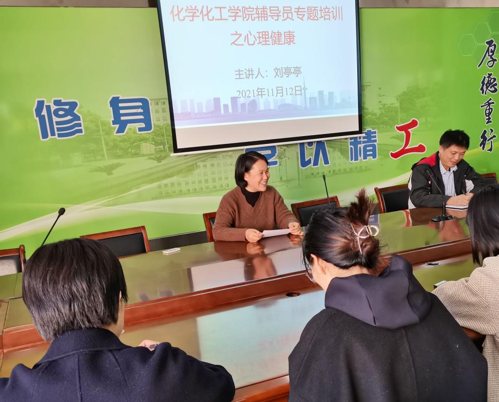 化学化工学院于2021年秋学期开展辅导员系列培训,共分四期专题,至11月17日结束。本次系列培训由学院党委书记高健主持,学院党委副书记江滔、学工办主任李慧和心理辅导员刘亭亭分别主讲,学院全体专兼职辅导员参加。