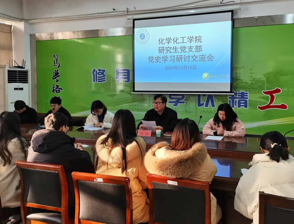 12月14日,化学化工学院研究生党支部在201会议室开展党史学习研讨,30名研究生党员参加研讨交流,学院党委副书记江滔主持,徐诗诗等4位研究生党员作重点发言。