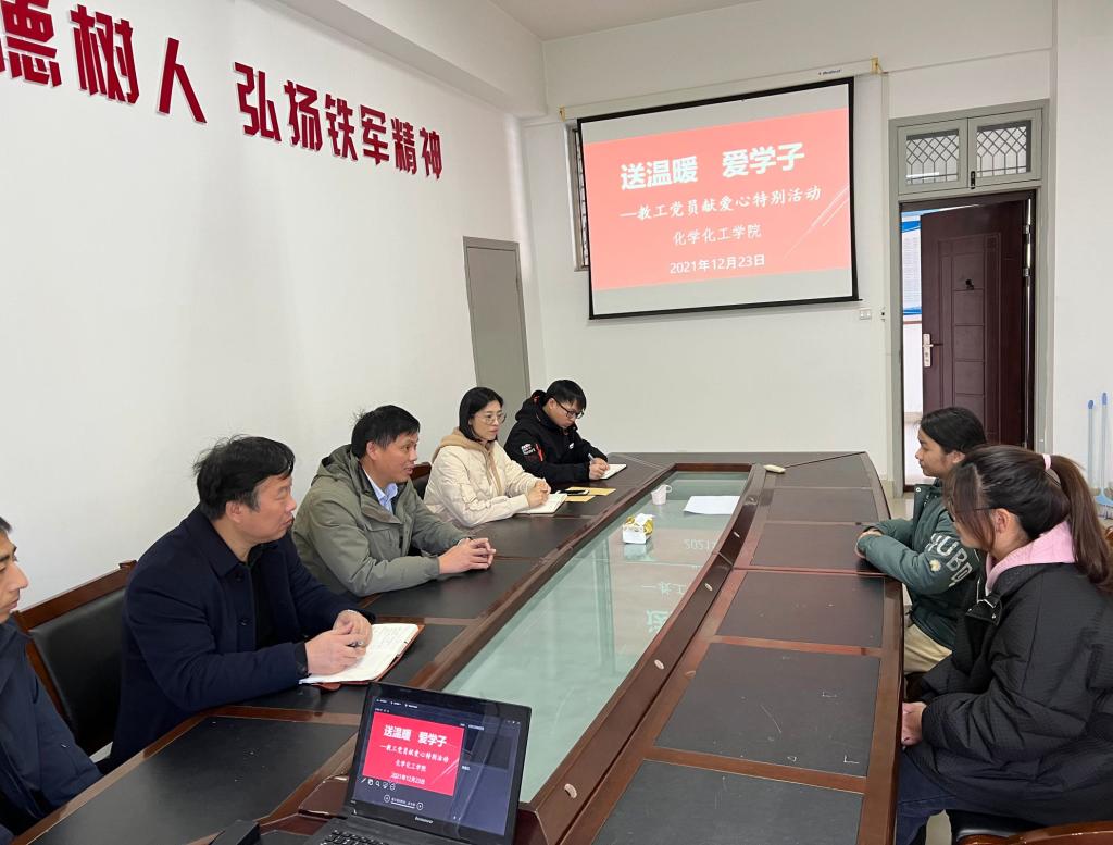 12月23日,化学化工学院在213会议室开展教工党员献爱心特别活动。学院党委书记高健主持,党委副书记江滔、学工办主任李慧、责任班级辅导员以及被慰问的学生参加。