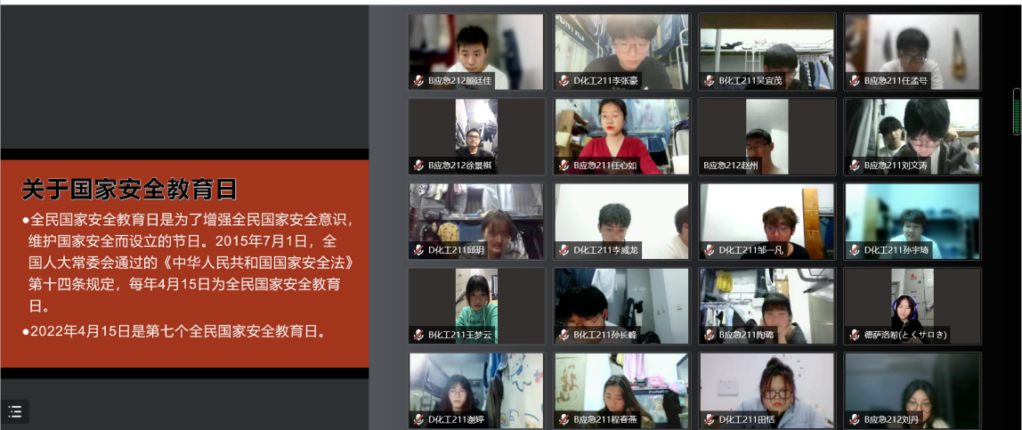 在线上活动中,学院组织师生开展国家安全教育日安全生产线上大讨论、主题“云”班会、在线党团日专题活动等进行交流学习;积极动员师生参与中国普法微信公众号举办的“415”全民国家安全教育日专项答题活动。