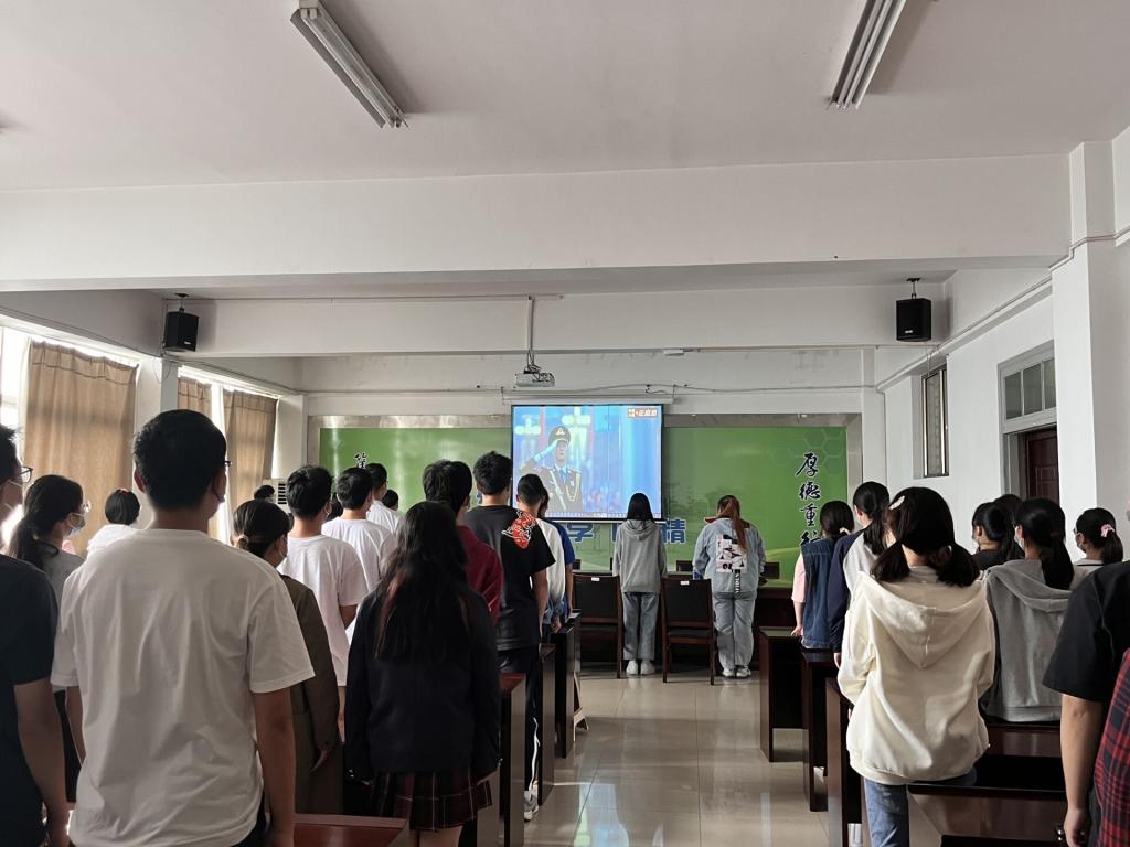 国旗与旭日同升,青春与梦想同行。上午8点30分,学院组织学生在本院201会议室观看天安门升旗仪式直播,同学们一个个坐姿笔挺,聚精会神的注视着屏幕前气势恢宏的天安门广场,透过直播,升旗仪式展现出的不仅是中国军人的风采,更是中国精神。伴随国歌奏起,国旗在同学们的注目礼中冉冉升起,把心中对祖国的满腔祝福伴随国旗升起一同放飞。