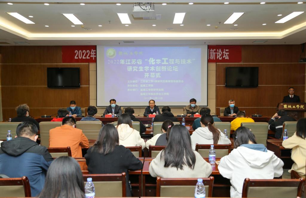 10月22日上午,2022年江苏省“化学工程与技术”研究生学术创新论坛开幕式在盐城工学院希望大道校区行政楼9楼会议室举行,本次论坛由江苏省工学3类研究生教育指导委员会主办,盐城工学院研究生院和化学化工学院共同承办,论坛以线上线下相结合的方式进行。中国工程院院士蒋剑春、南京理工大学钟秦教授、南京工业大学范益群教授、扬州大学庞欢教授等校外专家线上作学术报告。盐城市政协副主席、我校副校长丁成教授致辞,江苏省研究生工学3类教育指导委员会副主任委员范益群教授线上致辞。学校相关学院负责人及全省相关专业研究生参加本次论坛开幕式。开幕式由化学化工学院院长戴勇教授主持。
