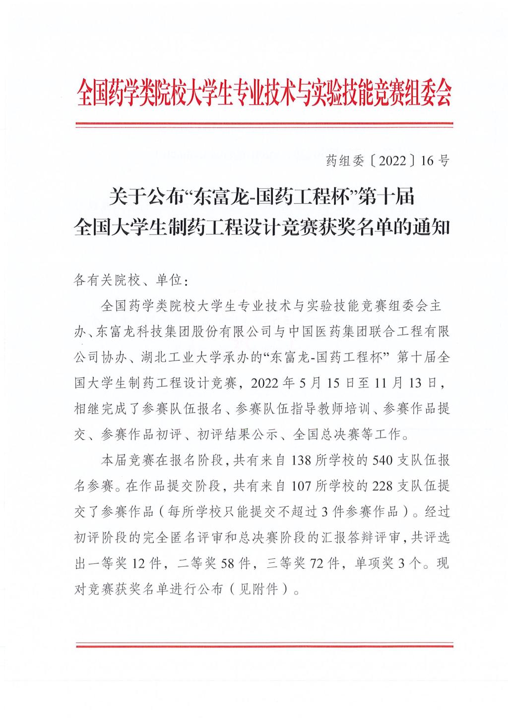 近日,由全国药学类院校大学生专业技术与实验技能竞赛组委会主办、东富龙科技集团股份有限公司与中国医药集团联合工程有限公司协办、湖北工业大学承办的“东富龙-国药工程杯”第十届全国大学生制药工程设计竞赛圆满落幕。本次竞赛以“年产7000万支新冠疫苗制剂车间工艺设计”为题,设计范围为疫苗制剂车间(含辅助生产设施),设计要求除满足药品生产质量管理规范(GMP)外,还需考虑在主工艺段留有参观空间。全国共有138所学校540支队伍报名参赛,其中107所学校228支队伍提交了参赛作品。