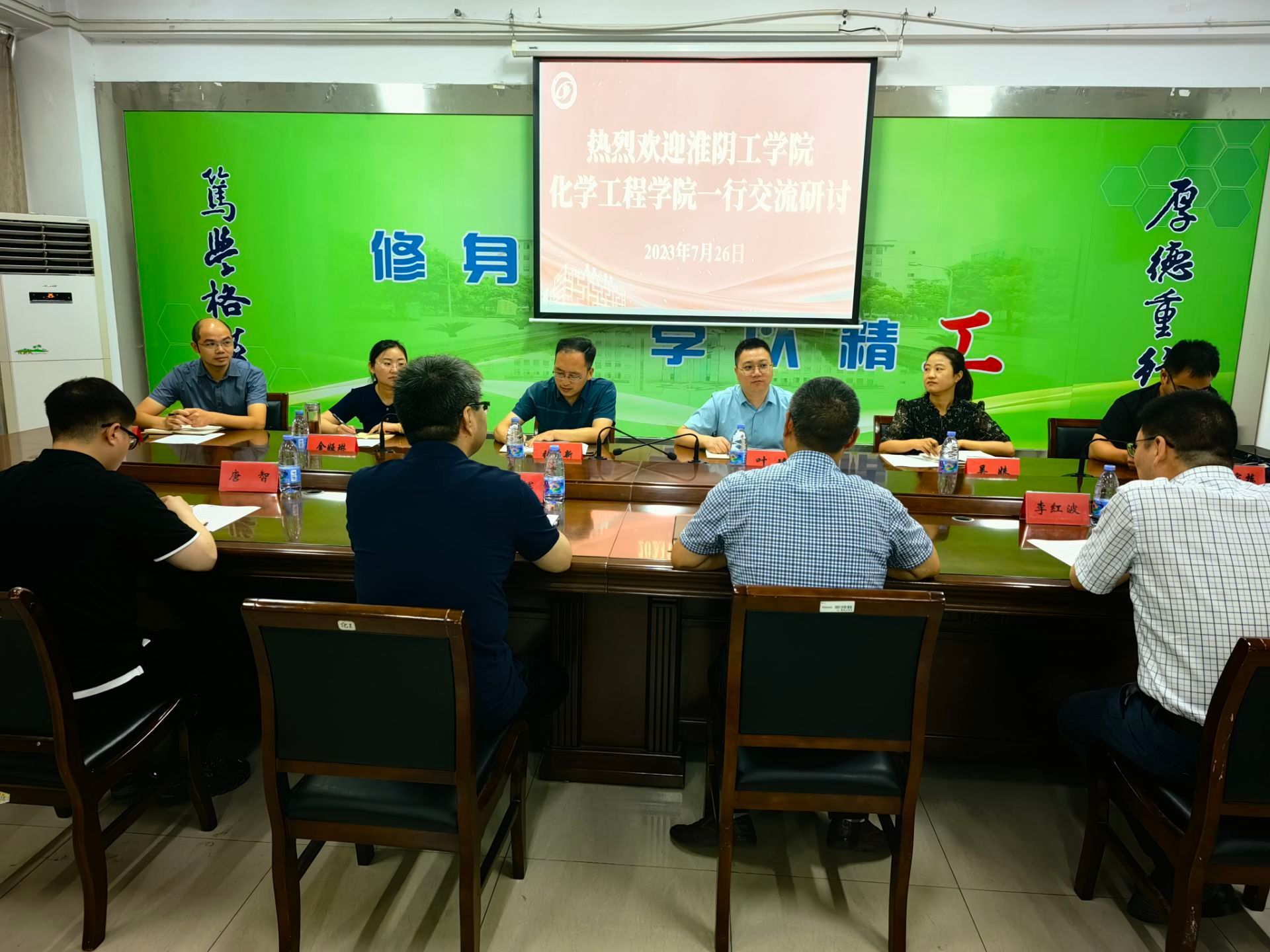 7月26日上午,淮阴工学院化学工程学院党委书记张常新、院长叶玮等领导班子一行6人来化学化工学院交流调研。化学化工学院院长戴勇、党委副书记庞辉、副院长李红波等参加交流会。