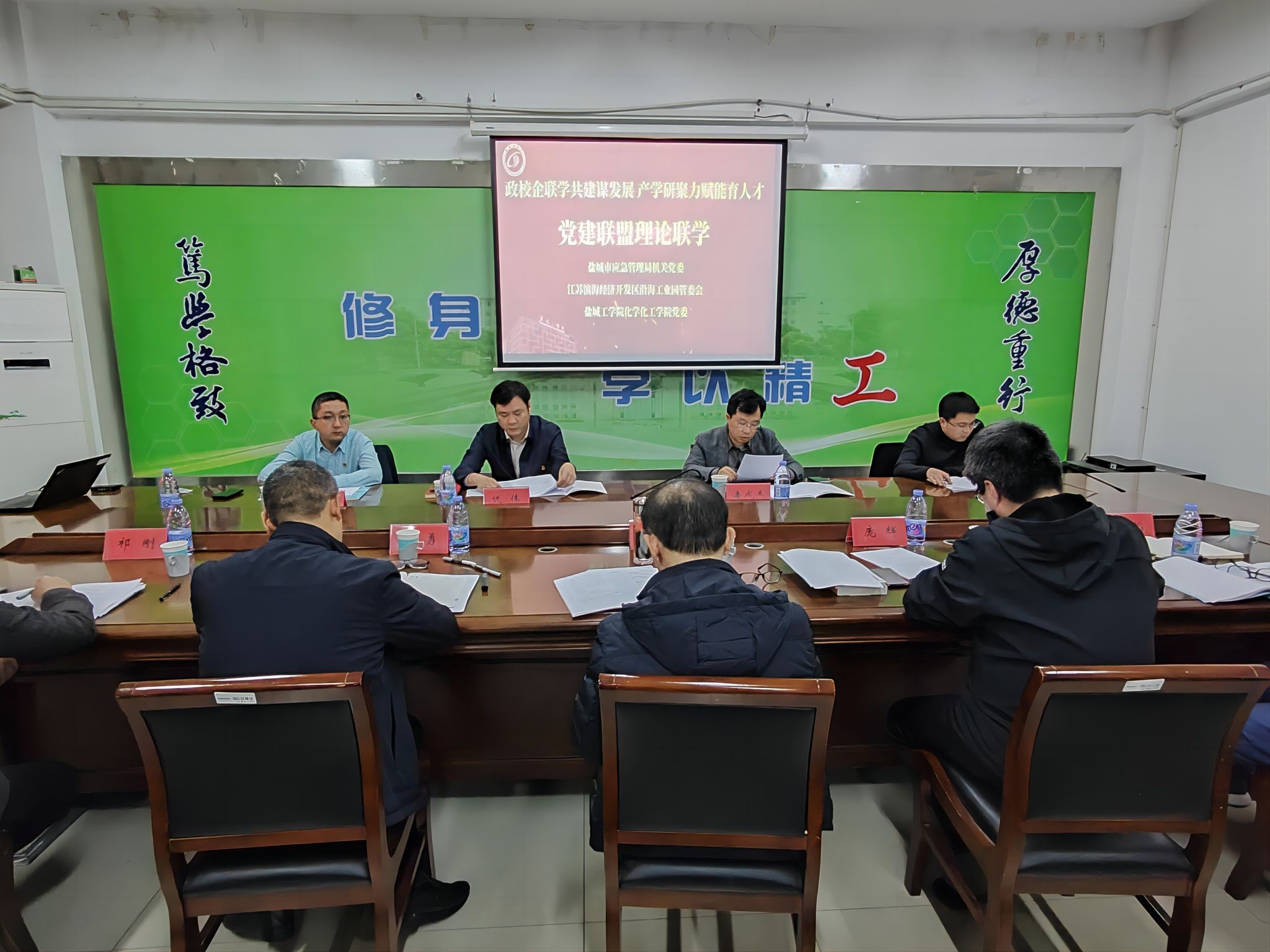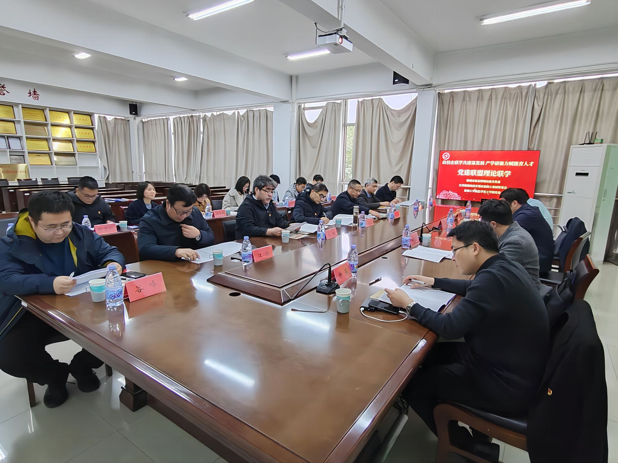 11月22日下午,化学化工学院党委以“政校企联学共建谋发展 产学研聚力赋能育人才”为主题,在学院201会议室组织开展党建联盟理论联学联建活动。校党委第一巡学旁听组组长谢毅敏、成员王丽坤到会指导,盐城市应急管理局机关党委专职副书记仇伟、法规处处长宋杰、江苏滨海经济开发区沿海工业园管委会副主任潘成杰、安委办主任徐焱参加活动并作重点发言。学院党委书记庞辉主持会议,学院党委理论中心组全体成员参加。